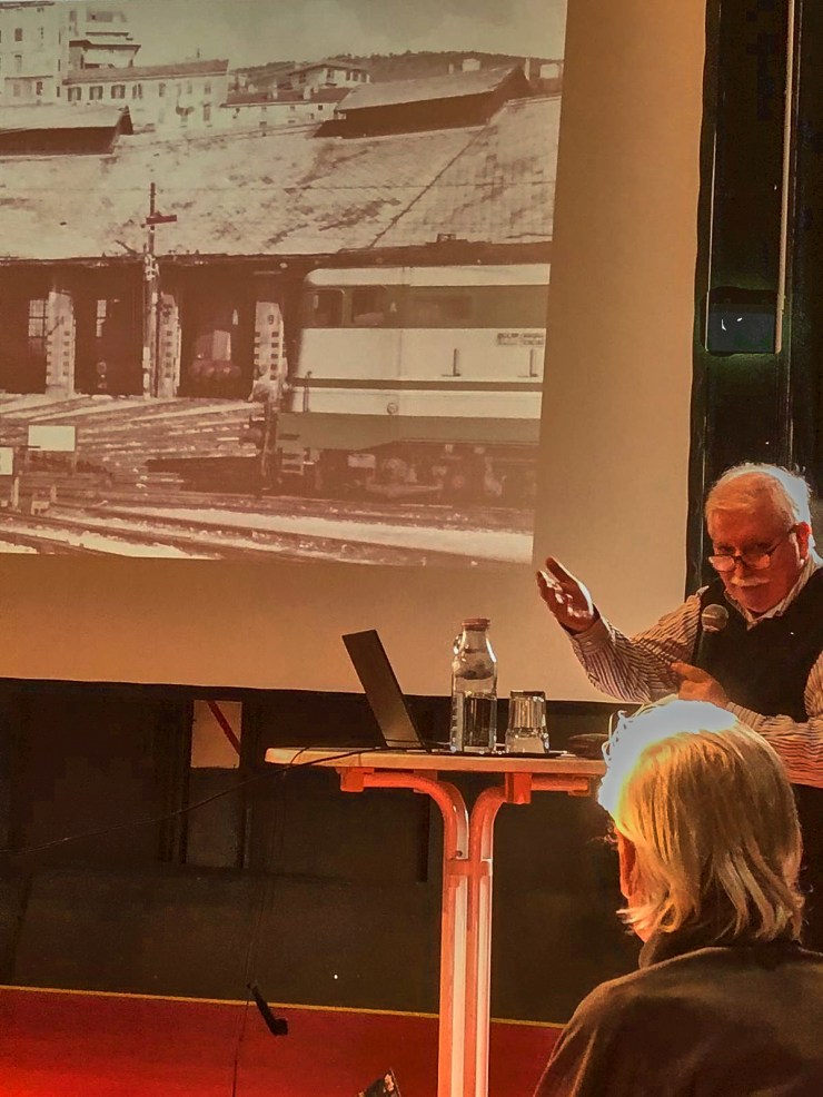 Sabato 25 settembre si è tenuta a Mürzzuschlag, presso il Südbahnmuseum una conferenza sul tema “Il porto di Trieste – ieri ed oggi”. L’evento, fortemente voluto dalla direttrice del Museo, sig.ra Kerstin Ogris, ha permesso al pubblico presente nella rimessa circolare, cui facevano da contorno le locomotive 180.01 kkStB ed il “coccodrillo” svizzero, di ascoltare la relazione del nostro Socio Franco Gioseffi.